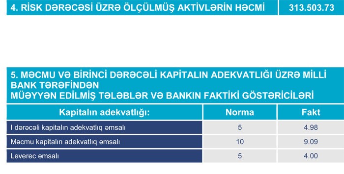 Bank ötən ilin sonunda 549 milyon 609 min manat cəmi aktivlərə, 476 milyon 741 min manat cəmi öhdəliklərə və 72 milyon 867 min manat cəmi balans kapitalına sahib idi.