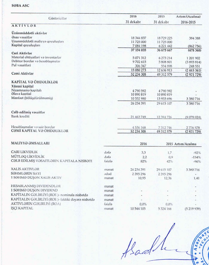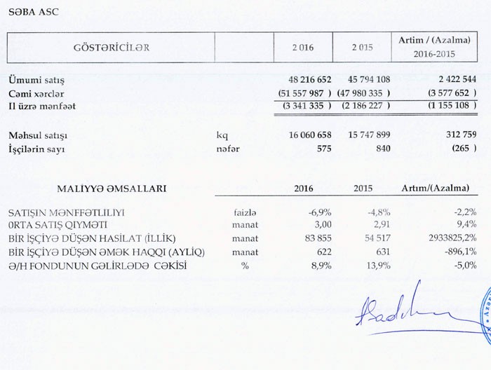"Marja" şirkətin maliyyə hesabatlarına istinadən xəbər verir ki, 2016-cı ildə ASC-nin satışları 48 milyon 216 min manat təşkil edib. Bu, 2015-ci illə müqayisədə 2 milyon 422 min manat və ya 5,3% çoxdur. "Səba" ASC 2015-ci ildə 45 milyon 794 min manat satış reallaşdırmışdı.