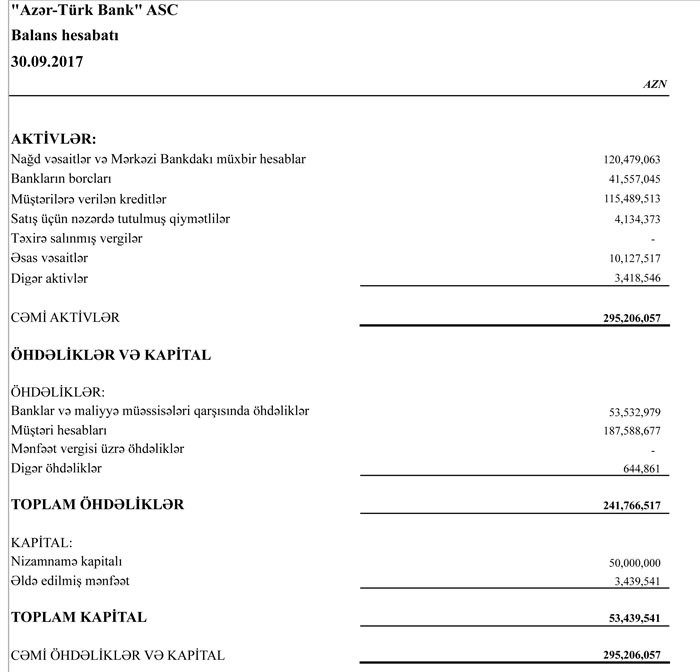 30 Sentyabr 2017-ci il tarixində “AzərTürkBank” 295 milyon 206 min manat cəmi aktivlərə, 241 milyon 766 min manat cəmi öhdəliklərə və 53 milyon 439 min manat cəmi balans kapitalına malik olub.
