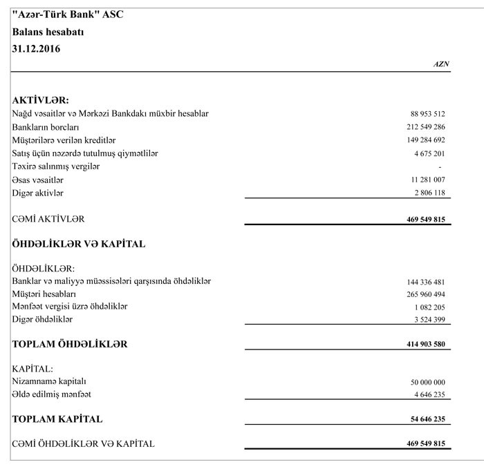 Ötən ilin sonunda Bank 469 milyon 549 min manat cəmi aktivlərə, 414 milyon 903 min manat cəmi öhdəliklərə və 54 milyon 646 min manat cəmi balans kapitalına malik idi. Aktiv və öhdəliklərin kəskin azalması Bankın verdiyi borcları geri yığaraq, öz öhdəliklərini azaltmasıdır.