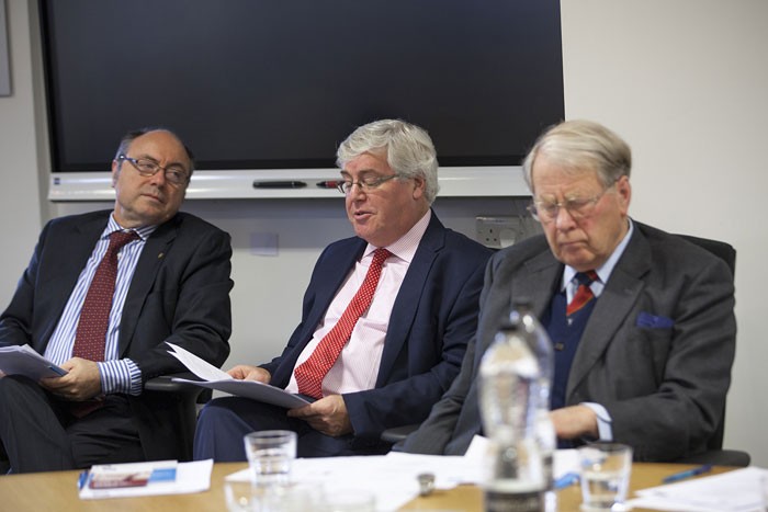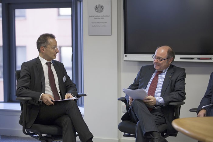 Avropa Şurasının Münsiflər Heyətinin sədri Cakomo Oberto (sağda); Ədliyyə nazirinin müavini, Məhkəmə-Hüquq Şurasının üzvü Azər Cəfərov (ortada);“Elektron məhkəmə” sisteminin yaradılması üzrə İşçi qrupunun rəhbəri, Yasamal Rayon Məhkəməsinin hakimi Ramin Qurbanov (solda)
