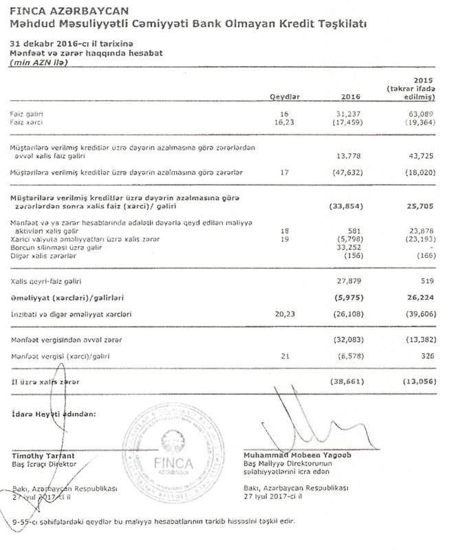 “FINCA Azerbaijan” Qeyri- Bank Kredit Təşkilatı 2016-cı ili 38 milyon 661 min manat zərər ilə başa vurub.