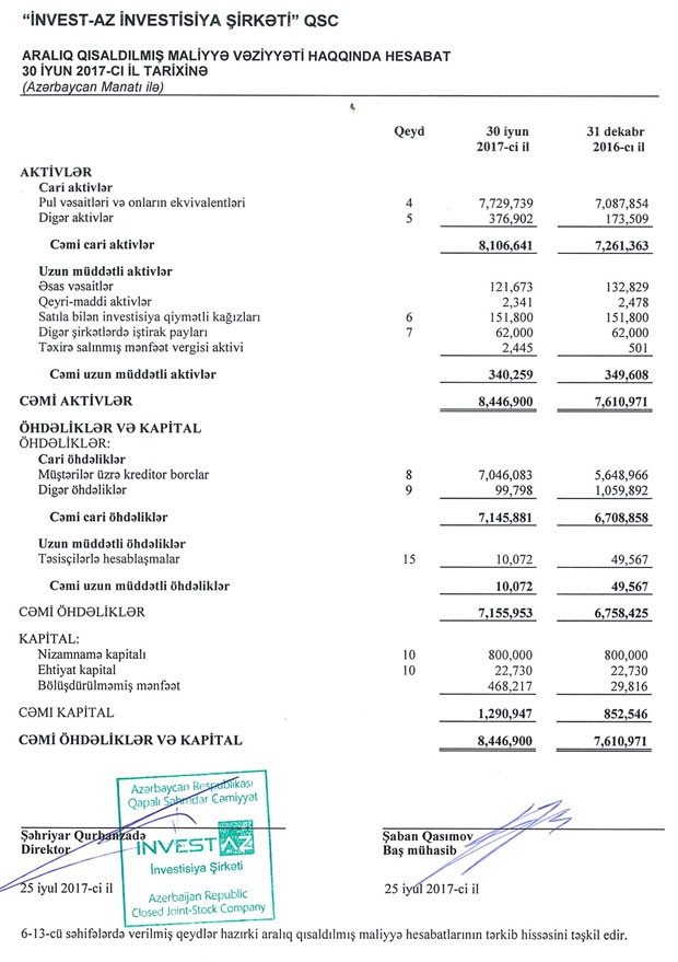 30 İyun 2017-ci il tarixində “İnvestAZ” 8 milyon 447 min manat cəmi aktivlərə, 7 milyon 155 min manat cəmi öhdəliklərə və 1 milyon 291 min manat cəmi kapitala malik olub.