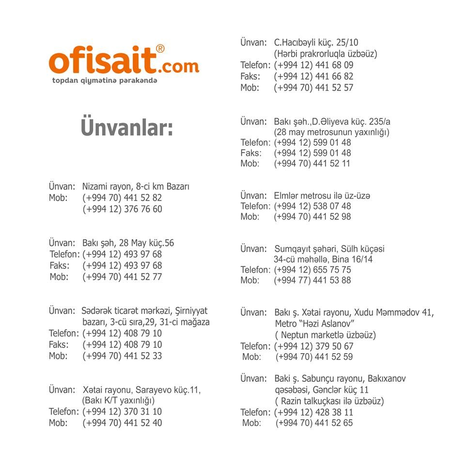 "Ofisait" mağazalarından dəftərxana,ofis, məktəb ləvazimatları, mətbəx və ev əşyaları, elektronik əşyalar, idman məhsulları, uşaq oyuncaqları, kitablar və s. bu kimi evinizin və ofisinizin lazım olan ehtiyaclarını qarşılamaq üçün yararlana bilərsiniz.