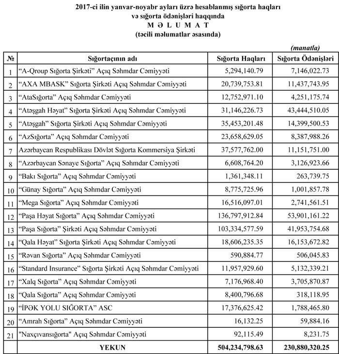 2017-ci ilin 11 ayı ərzində PAŞA Həyat sığorta şirkəti 136,8 milyon manat, PAŞA Sığorta isə 103,3 milyon manat sığorta haqları toplayıb. Bu iki sığorta şirkətinin topladıqları sığorta haqları 504,2 milyon manatlıq cəmi bazarın təxminən 48%-dir.