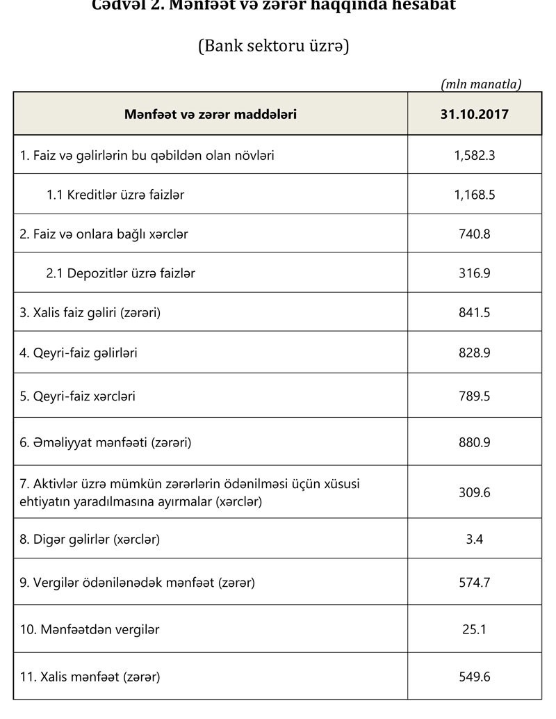 Noyabrın 1-nə bankların xalis mənfəəti 549,6 milyon manat təşkil etmişdi. Banklar noyabrda 43,1 milyon manat qazanıblar.