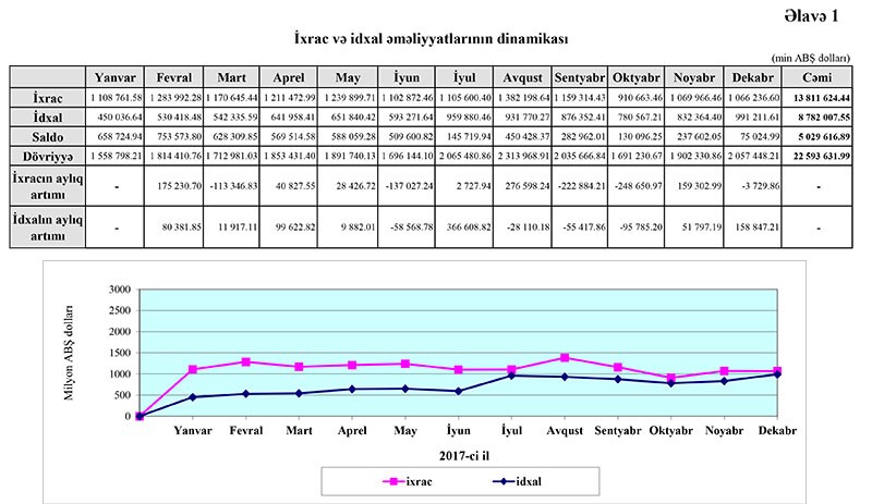 2017-ci ilin dekabr ayında Azərbaycanın idxalı 991 milyon 211 min dollar təşkil etmişdir ki, bu da ötən il qeydə alınmış ən yüksək aylıq idxaldır.