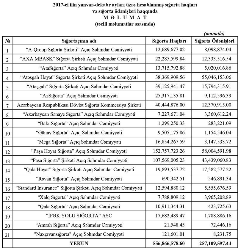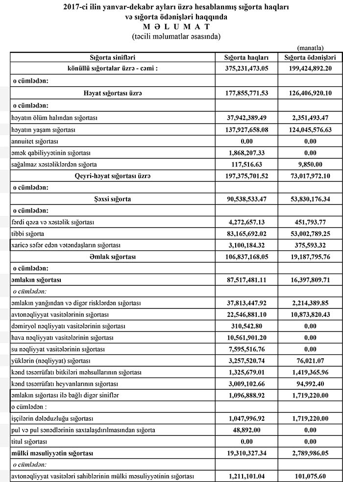 Qeyd edək ki, 2016-cı ilin yanvar-dekabr ayları ərzində 486 milyon 74 min manat sığorta haqları toplanmış, 237 milyon 250 min manat sığorta ödənişləri həyata keçirilmişdi.