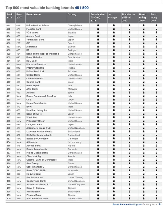 Beynəlxalq marka qiymətləndirmə təşkilatı "Brend Finance"ın hazırladığı "Dünyanın Ən Dəyərli 500 Bank Markası-2018" araşdırması dərc olunub.