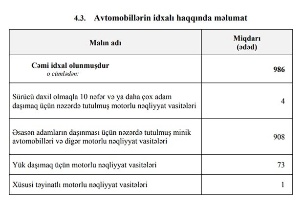2018-ci ilin Yanvar ayında Azərbaycana 986 ədəd nəqliyyat vasitəsi gətirilib.