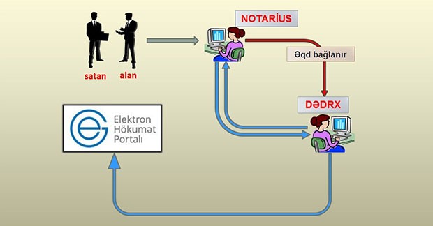 Əmlak Məsələləri Dövlət Komitəsindən "Marja"ya daxil olmuş məlumata görə, daşınmaz əmlak və torpaq mülkiyyətçiləri, həmçinin bələdiyyələr təkrar bazarda alqı-satqı prosesini onlayn rejimdə rəsmiləşdirə bilirlər. Bu prosesdə notariuslarda alqı-satqı əməliyyatı aparılarkən əmlakın yüklülüyünə dair məlumat 10-15 saniyə ərzində onlayn rejimdə əldə edilir. Daha sonra alqı-satqı prosesi aparılaraq müqavilə imzalanır. Müqavilə elektron şəkildə reyestr xidmətinin yerli ərazi idarələrinə ötürülür. Qeydiyyat orqanı da bu müqavilə əsasında daşınmaz əmlakın və torpağın yeni sahibinin adına elektron formada çıxarış tərtib edir.