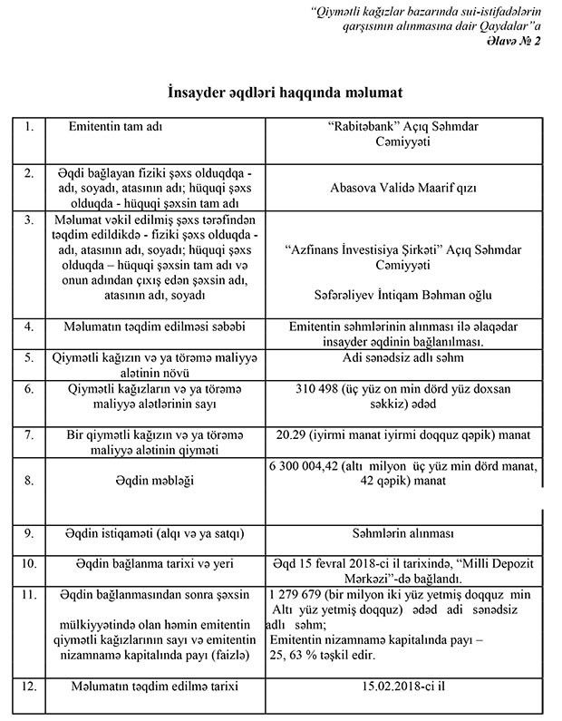 Əliyev Rauf Zeynal oğlu iki müqavilə ilə hər birinin nominal dəyəri 20,29 manat olan 515 517 səhmi əldə edib (cəmi 10 459 838 manat). Nəticədə onun Bankın nizamnamə kapitalında payı 1 497 783 ədəd səhmlə 30%-ə qalxıb. Rauf Əliyev 15 Fevral tarixində bağlanmış müqavilə ilə 6 500 002,95 manatlıq, 21 fevral 2018-ci il tarixində bağlanmış müqavilə ilə isə 3 959 836.98 manatlıq səhm alınıb.