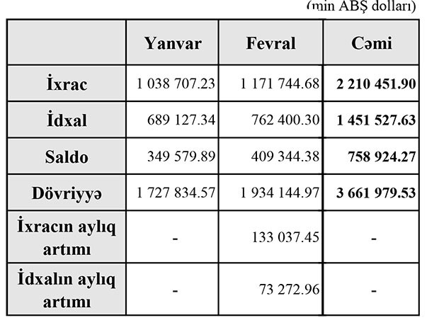 Fevralda saldo müsbət 409 milyon 344.38 min dollar, Yanvar -Fevral ayları üzrə isə müsbət 758 milyon 924 min dollar təşkil edib.