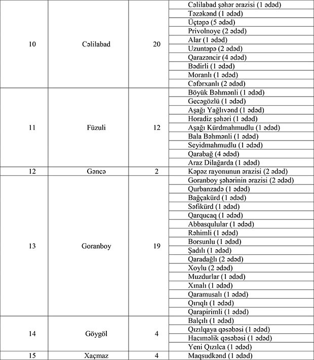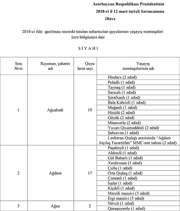 "Marja" xəbər verir ki, əhalisi 597 min nəfərə yaxın olan 38 şəhər və rayonun 248 yaşayış məntəqəsində (siyahı əlavə olunur) 8740 hektar əkin sahəsinin və əkin üçün istifadə olunan həyətyanı torpaq sahələrinin suvarma suyu ilə təminatının yaxşılaşdırılması, yeni suvarılacaq torpaqların suvarma suyuna, habelə əhalinin içməli suya olan tələbatının ödənilməsi üçün 2018-ci ildə 300 ədəd subartezian quyusunun layihələndirilməsini və qazılmasını təmin etmək məqsədi ilə Azərbaycan Respublikası Prezidentinin 2018-ci il 22 yanvar tarixli 3593 nömrəli Sərəncamı ilə təsdiq edilmiş “Azərbaycan Respublikasının 2018-ci il dövlət büdcəsində dövlət əsaslı vəsait qoyuluşu (investisiya xərcləri) üçün nəzərdə tutulan vəsaitin bölgüsü”nün 1.47.13-cü yarımbəndində göstərilmiş məbləğin 21 milyon manatı Azərbaycan Meliorasiya və Su Təsərrüfatı Açıq Səhmdar Cəmiyyətinə ayrılıb.