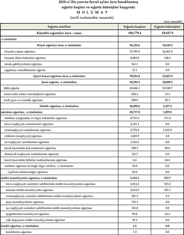 2018-ci ilin yanvar-fevral ayları ərzində ölkədə fəaliyyət göstərən 21 sığorta şirkəti tərəfindən 130.2 mln. manat məbləğində sığorta haqları toplanmış, 40.5 mln. manat məbləğində sığorta ödənişi aparılmışdır.