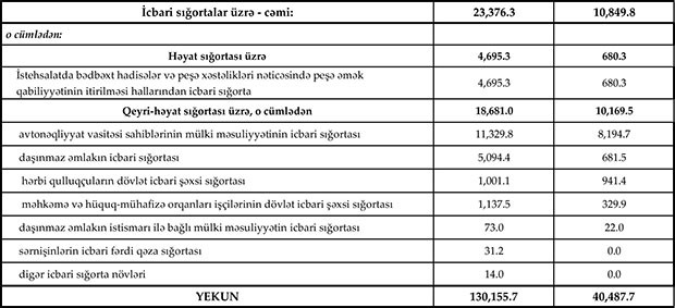 Könüllü sığorta bazarı üzrə haqlar 106.8 mln. manat, ödənişlər isə 29.6 mln. manat təşkil etmişdir. İcbari sığorta bazarı üzrə haqlar 23.4 mln. manat, ödənişlər isə 10.9 mln. manat olmuşdur.