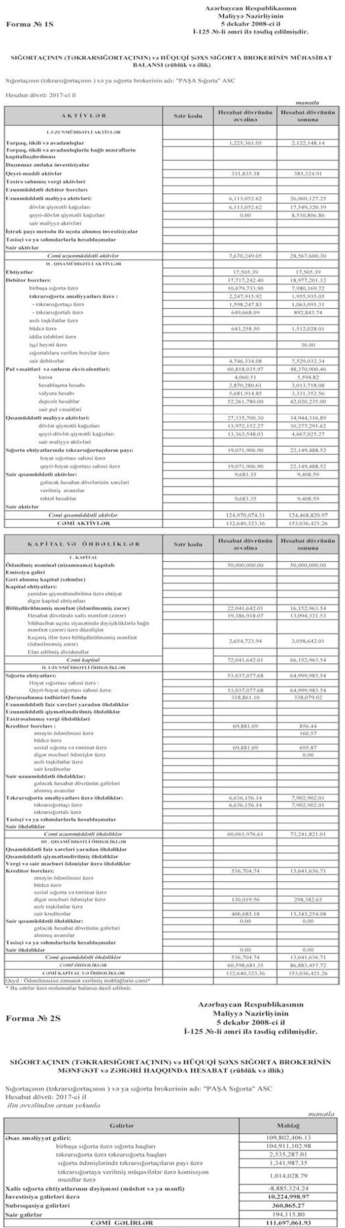 31 Dekabr 2017-ci il tarixində “PAŞA Sığorta” 153 milyon 36 min manat cəmi aktivlərə, 66 milyon 152 min manat cəmi kapitala və 86 milyon 883 min manat cəmi öhdəliklərə malik olub. Şirkət 2016-cı ilin sonunda 132 milyon 640 min manat cəmi aktivlərə, 72 milyon 41 min manat cəmi kapitala və 60 milyon 598 min manat cəmi öhdəliklərə malik idi.