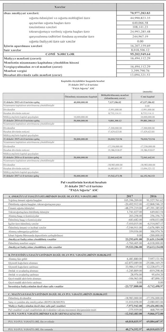 2016-cı ildə “PAŞA Sığorta”nın cəmi gəlirləri 104 milyon 643 min manat, cəmi xərcləri isə 80 milyon 983 min manat təşkil etmişdi. 23 milyon 659 min manatlıq maliyyə mənfəətindən 4 milyon 272 min manat mənfəət vergisi ödənmişdi.