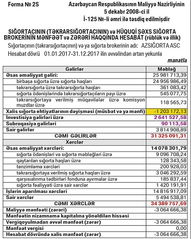 “Marja” şirkətin maliyyə hesabatlarına istinadən xəbər verir ki, ötən il “AzSığorta”nın cəmi gəlirləri 31 milyon 325 min manat, cəmi xərcləri 34 milyon 389 min manat təşkil edib. 2016-cı ildə Şirkətin cəmi gəlirləri 28 milyon 844 min manat, cəmi xərcləri isə 25 milyon 970 min manat təşkil etmiş, 574,8 min manat mənfəət vergisi ödəmişdi. İllik müqayisədə “AzSığorta”nın gəlirləri artsa da, əməliyyat və işlərin aparılması xərcləri artdığından ötən ili zərər ilə başa vurub.