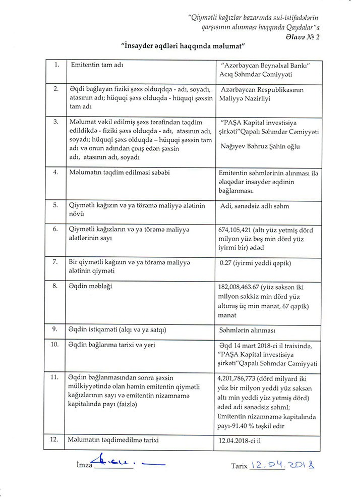 "Azərbaycan Beynəlxalq Bankı" ASC-nin hər birinin nominal dəyəri 0,27 manat olan 674 105 421 ədəd səhmini (182 milyon 8 min 464 manatlıq) Maliyyə Nazirliyi əldə edib.