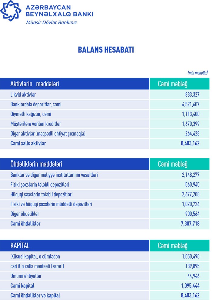 Bank ötən ilin sonunda 8 milyard 695 milyon manat cəmi aktivlərə, 7 milyard 746 milyon manat cəmi öhdəliklərə və 948 milyon 186 min manat cəmi kapitala malik idi.