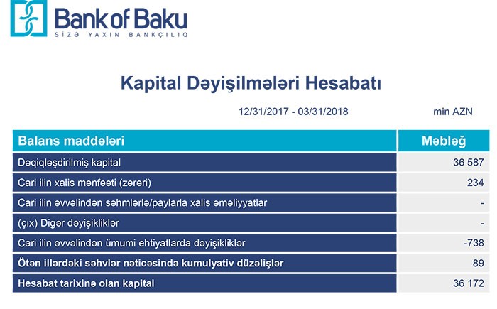 31 Mart 2018-ci il tarixində “Bank of Baku” 22 milyon 259 min manat məcmu kapitala malik olub.