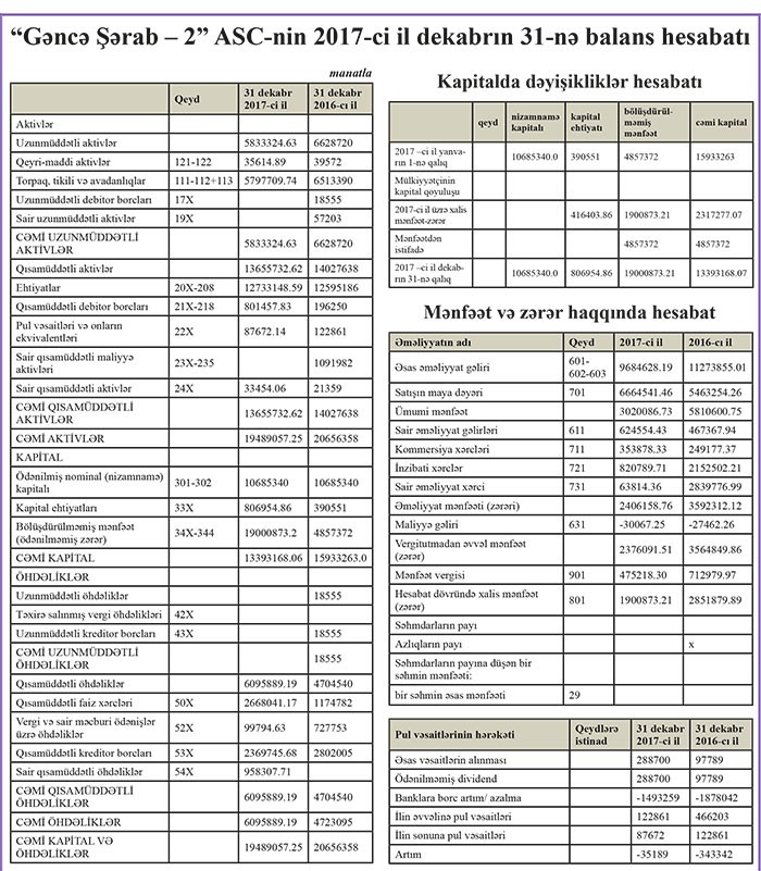 Azərbaycanda şərab, konyak, araq və spirt istehsalçısı "Gəncə-Şərab" ASC 2017-ci ili 1 milyon 901 min manat xalis mənfəət ilə başa vurub. Bu, 2016-cı illə müqayisədə 33% azdır. ASC 2016-cı ili 2 milyon 852 min manat xalis mənfət ilə bağlamışdı.