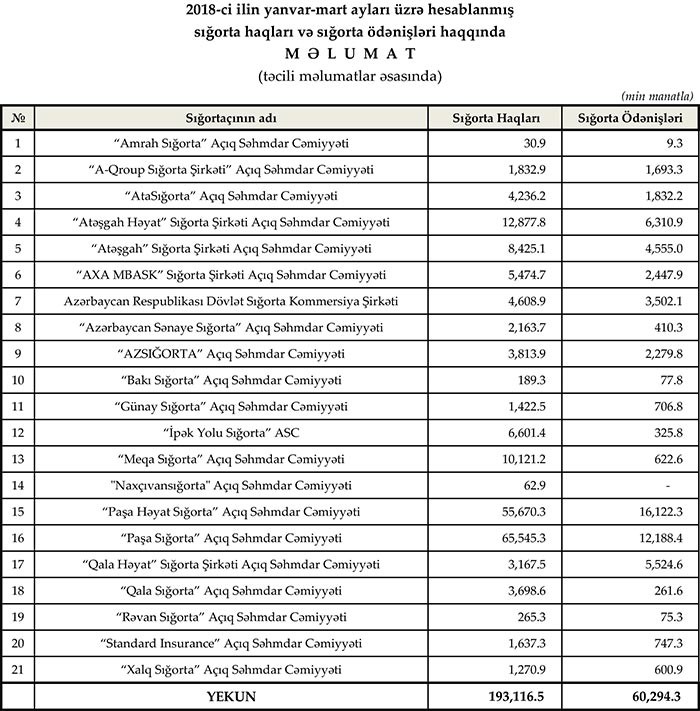 2018-ci ilin yanvar-mart ayları ərzində ölkədə fəaliyyət göstərən 21 sığorta şirkəti tərəfindən 193.1 milyon manat məbləğində sığorta haqları toplanmış, 60.3 mln. manat məbləğində sığorta ödənişi aparılmışdır.