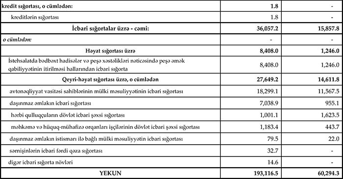 Könüllü sığorta bazarı üzrə haqlar 157.1 mln. manat, ödənişlər isə 44.4 mln. manat təşkil etmişdir. İcbari sığorta bazarı üzrə haqlar 36 mln. manat, ödənişlər isə 15.9 mln. manat olmuşdur.