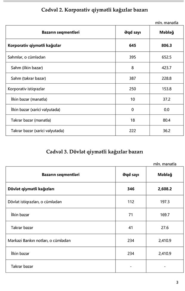 2018-ci ilin I rübü ərzində qiymətli kağızlar bazarında 6.2 mlrd. manat həcmində əməliyyat aparılmışdır ki, bu da ötən ilin müvafiq dövrü ilə müqayisədə 2.7 dəfə çoxdur. Əməliyyatların 48%-i (3 mlrd. manat) ilkin bazarda, 52%-i (3.2 mlrd. manat) isə təkrar həyata keçirilmişdir.
