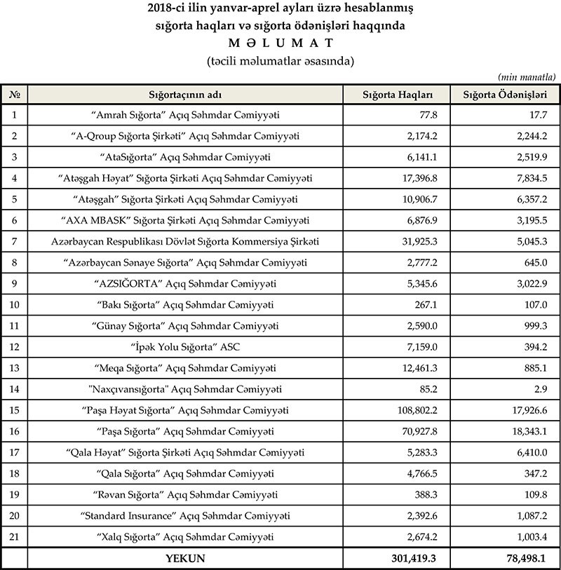 2018-ci ilin yanvar-aprel ayları ərzində ölkədə fəaliyyət göstərən 21 sığorta şirkəti tərəfindən toplanmış sığorta haqları və ödənişləri
