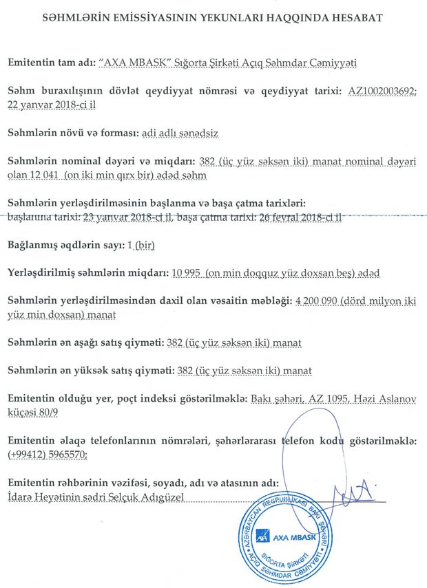 “AXA MBASK” Sığorta Şirkəti ASC-dən bildirilib ki, səhmləri qapalı yerləşdirmə üsulu ilə şirkətin yeganə səhmdarı olan AXA əldə edib.