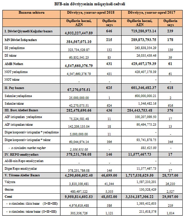 2018-ci ilin yanvar-aprel ayları ərzində Bakı Fond Birjasında bütün alətlər üzrə keçirilən əqdlərin ümumi həcmi 9 milyard 950 milyon manat təşkil etmişdir. Bu, ötən ilin eyni dövrü ilə müqayisədə təxminən 3 dəfə çoxdur.