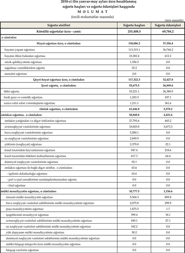 2018-ci ilin yanvar-may ayları ərzində ölkədə fəaliyyət göstərən 21 sığorta şirkəti tərəfindən 350.8 mln. manat məbləğində sığorta haqları toplanıb, 97.5 mln. manat məbləğində sığorta ödənişi həyata keçirilib.