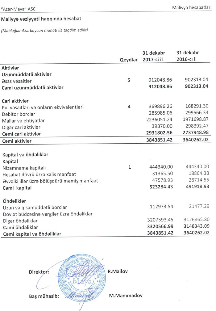 31 Dekabr 2017-ci il tarixində “Azər-Maya” ASC 3 milyon 844 min manat cəmi aktivlərə, 3 milyon 320 min manat cəmi öhdəliklərə və 523 min manat cəmi kapitala malik olub.