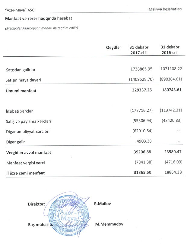 "Marja" şirkətin maliyyə hesabatına istinadən xəbər verir ki, 2016-cı illə müqayisədə ötən il ASC-nin satışdan gəlirləri 62% artaraq 1 milyon 738 min 865 manata yüksəlib. ASC satışdan 2016-cı ildə 1 milyon 71 min manat, 2015-ci ildə isə 541 min manat gəlir əldə etmişdi. Son 2 ildə “Azər-Maya”nın satışdan gəlirləri 3 dəfə artıb. Gəlirlər 3 dəfə artsa da şirkətin xalis mənfəəti 36% artıb.