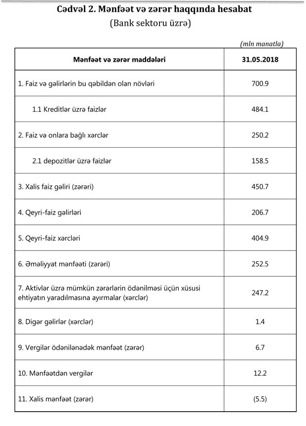 31 may 2018-ci il tarixinə bank sektorunun əsas göstəriciləri bank sektorunun icmal göstəricilərində öz əksini tapmışdır.