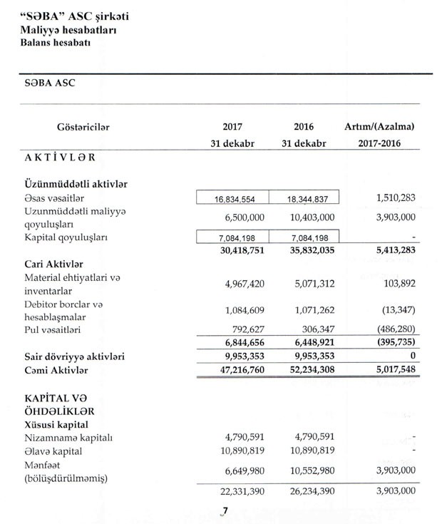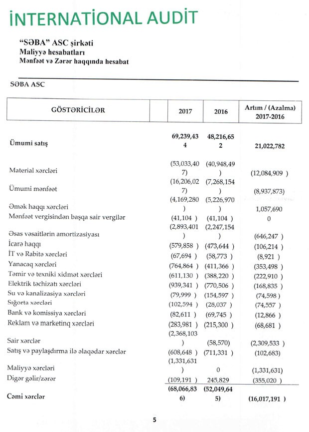 Ötən il ASC-nin cəmi xərcləri 68 milyon 66 min manat təşkil etdiyindən, il üzrə 1 milyon 173 min manat xalis mənfəət təmin edilib. "SƏBA" 2016-cı ili 3 milyon 341 min manat zərər ilə bağlamışdı.