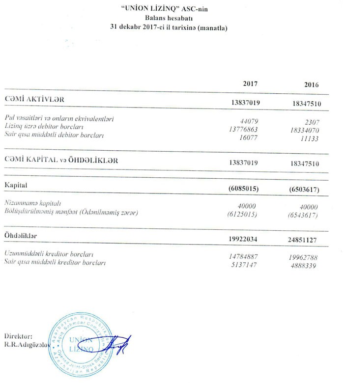 “Union Lizinq” ASC 2017-ci ili 418 min 602 manat xalis mənfəətlə başa vurub. Şirkət 2016-cı ildə 427 min 931 manat xalis mənfəət əldə etmişdi.