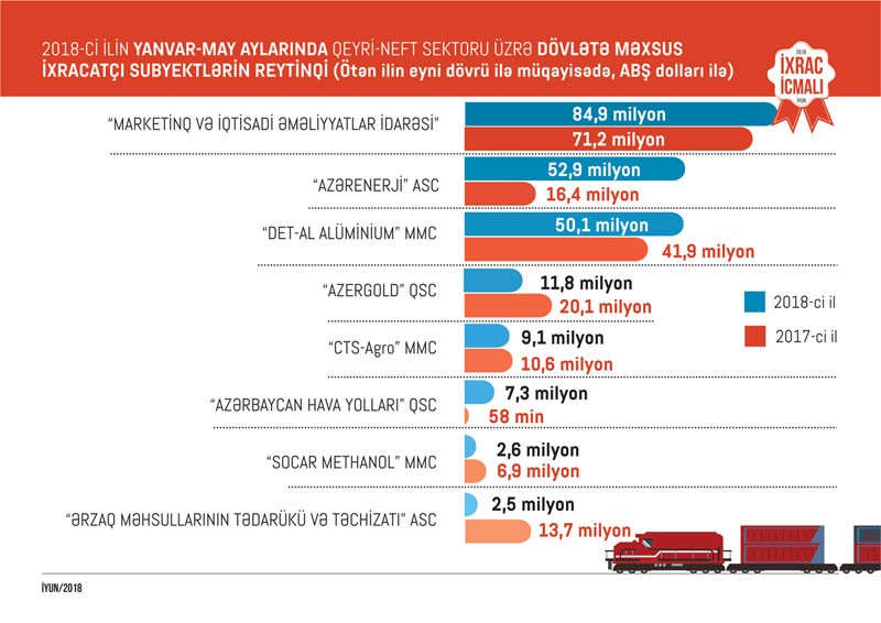 2018-ci ilin yanvar-may aylarında isə "Kapitan Fruits" MMC 16,2 milyon dollarlıq, "Qala meyvə-tərəvəz ixracat idxalat" MMC 16,2 milyon dollarlıq, ,“Azfruittrade” MMC 12,2 milyon dollarlıq, “Şirin Aqro” 10,3 milyon dollarlıq, "Metalçılar-2" isə 9,6 milyon dollarlıq mallar ixrac edib.
