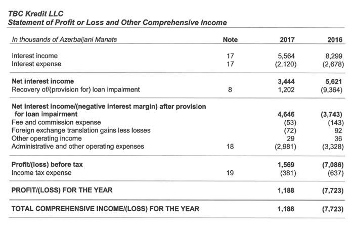 2016-cı ildə “TBC Kredit”in faiz gəlirləri 8 milyon 299 min manat təşkil etsə də, ehtiyatlara 9 milyon 364 min manat ayrıldığından təşkilat həmin ili zərər ilə bağlamışdı.