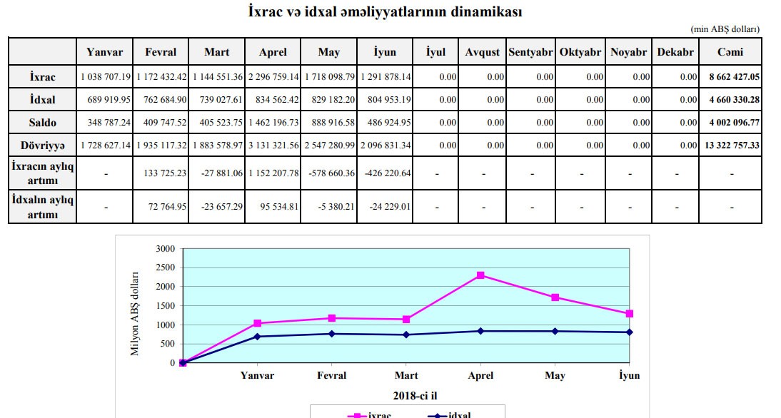 İyunda ixrac 1 milyard 291 milyon 878 min dollar, idxal isə 804 milyon 953 min dollar, saldo müsbət 486 milyon 924 min dollar təşkil edib. Apreldə saldo 1 milyard 462 milyon 196 min dollar, Mayda isə 888 milyon 916 min dollar təşkil etmişdi. Saldo aydan-aya azalır.