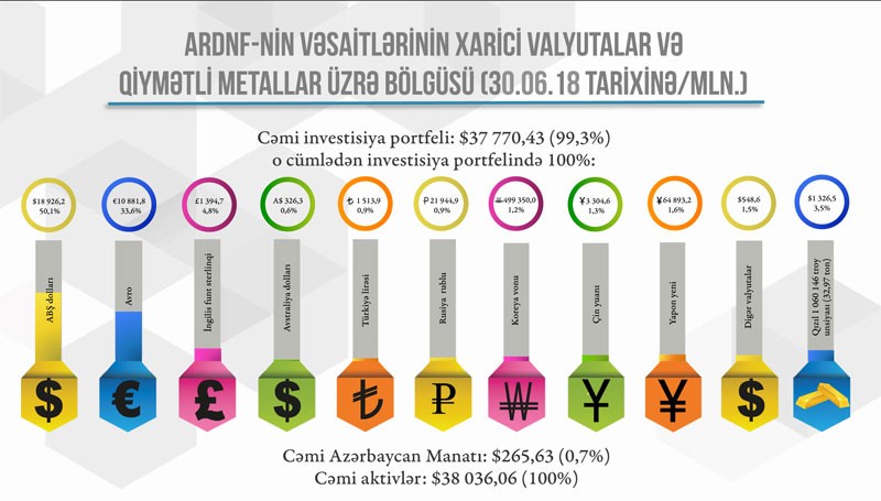 Bu vəsaitin 50,1%-i elə dollarda, 33,6%-i avroda, 4,8%-i isə ingilis funtsterlinqində yerləşdirilib.