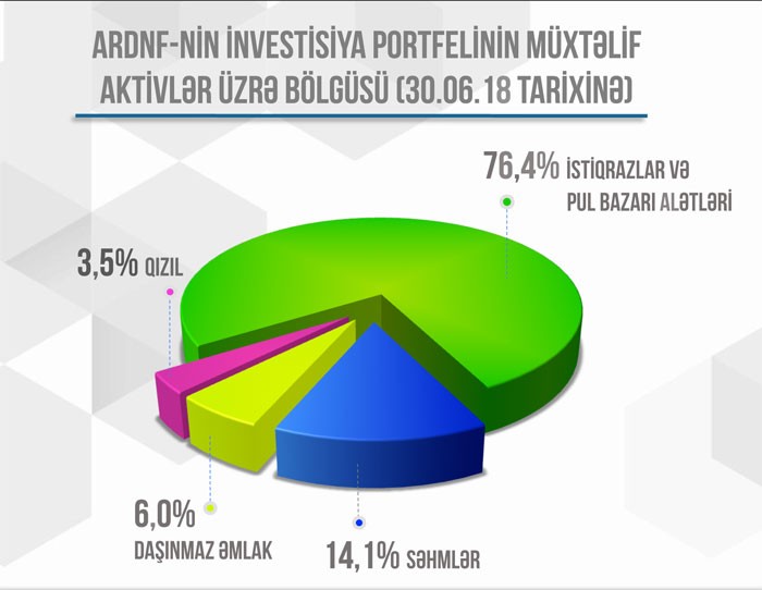 ARDNF investisiya portfelinin xarici valyutalar və qiymətli metallar üzrə bölgüsü ilə yanaşı, müxtəlif aktivlər üzrə bölgüsünü də açıqlayıb. Beləliklə, Fondun investisiya portfelində istiqrazların və pul bazarı alətlərinin payı 76,4%, səhmlərin payı 14,1%, daşınmaz əmlakın payı 6%, qızılın payı isə bir qədər əvvəl deyildiyi kimi, 3,5% təşkil edib.
