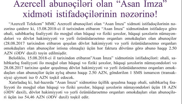 15.08.2018-ci il tarixdən "Asan İmza" xidmətindən istifadəyə görə əhali, sahibkarlıq fəaliyyəti ilə məşğul olan hüquqi və fiziki şəxslər, hüquqi şəxslərin nümayəndələri və dövlət hakimiyyəti və yerli özünüidarəetmə orqanlarının əməkdaşları olan "Azercell" abunəçiləri (28.08.2017-ci il tarixdən etibarən dövlət hakimiyyəti və yerli özünüidarəetmə orqanlarının əməkdaşları olan abunəçilər istisna olmaqla) üçün hər faktura dövrünə görə abunə haqqı 2.50 AZN (ƏDV daxil) təyin edilib.