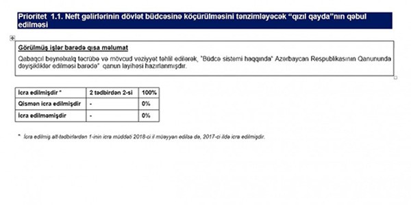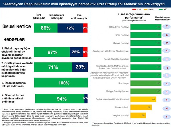 İqisadiyyat Nazirliyi, Təhsil Nazirliyi, Maliyyə Nazirliyi, Azərbaycan Milli Elmlər Akademiyası, Dövlət Statistika Komitəsi, Standartlaşdırma, Metrologiya və Patent üzrə Dövlət Komitəsi, Prezident yanında Vətəndaşlara Xidmət və Sosial İnnovasiyalar üzrə Dövlət Agentliyi, Komissiya və Maliyyə Sabitliyi Şurası “Milli iqtisadiyyat perspektivi üzrə strateji yol xəritəsində” 2017-ci ildə nəzərdə tutulan tədbirləri 100 faiz icra edib. Əmlak Məsələləri Dövlət Komitəsi 83 faiz, Mərkəzi Bank 69 faiz və Vergilər Nazirliyi 50 faizlik icra göstəricisinə malikdirlər”
