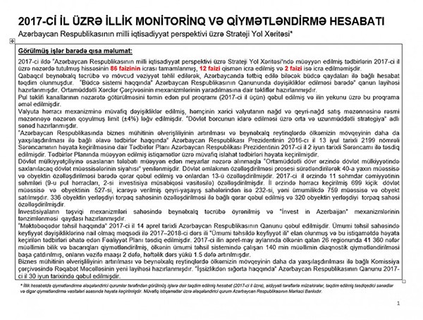 Milli iqtisadiyyat və iqtisadiyyatın əsas sektorları üzrə strateji yol xəritələrinin 2017-ci il üzrə nəzərdə tutulan hissəsinin monitorinq və qiymətləndirmə nəticələri ictimaiyyətə açıqlanıb.