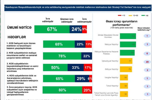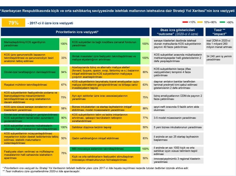 "Azərbaycan Respublikasının kiçik və orta sahibkarlıq səviyyəsində istehlak mallarının istehsalı üzrə Strateji Yol Xəritəsi”ndə müəyyən edilmiş tədbirlərin 2017-ci ilə nəzərdə tutulmuş hissəsinin 67 faizinin icrası tamamlanıb, 24 faizi qismən icra edilib, 9 faizi isə icra edilməyib.