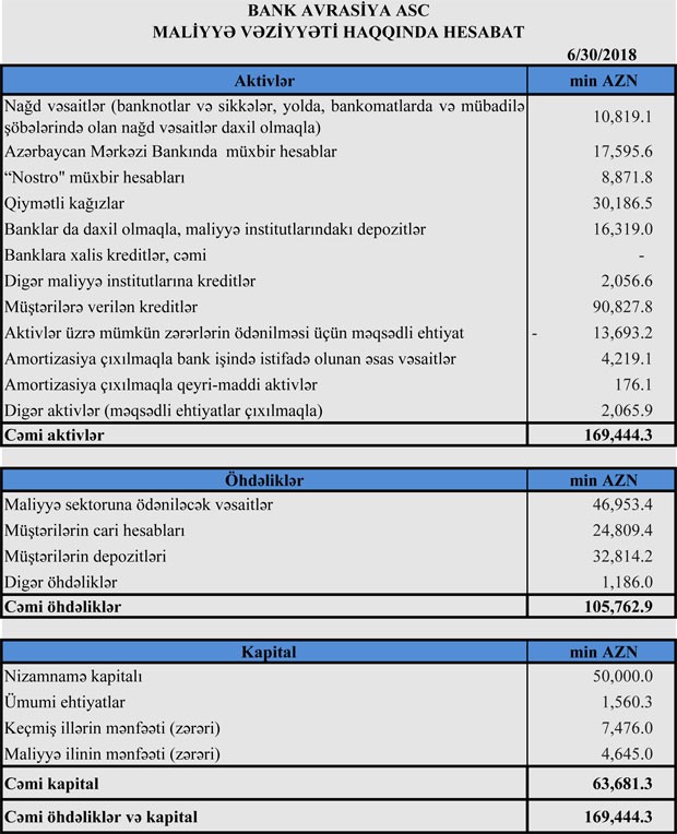 30 İyun 2018-ci il tarixində “Bank Avrasiya” 169 milyon 444 min manat cəmi aktivlərə, 105 milyon 762 min manat cəmi öhdəliklərə və 63 milyon 681 min manat cəmi kapitala malik olub.