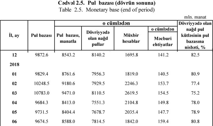 May ayı ilə müqayisədə İyunda pul bazası 57,6 milyon manat azalaraq 9 milyard 674.5 milyon manata düşüb. Manatla pul bazası isə 183,5 milyon manat artaraq 8 milyard 588 milyon manata çatıb. Müxbir hesablar isə 193,4 milyon manat azalaraq 1 milyard 842 min manata düşüb.